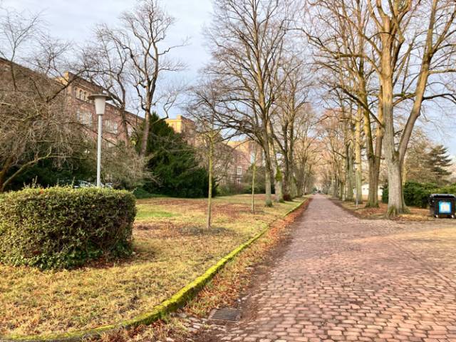 Immer wenn wir einen Spaziergang zum Schloss machen, wähle ich den Weg hinter der Oberfinanzdirektion entlang. Die Szene erinnert an eine andere Zeit im Sinne einer Filmkulisse. Mit dem Fahrrad meide ich diese grob gepflasterte Straße und denke dabei auch an Radfahrer*innen in Berlin oder Leipzig. Dort gibt es recht viele derartige Straßen –