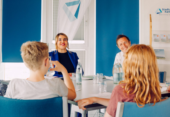Bei uns arbeiten rund 1.200 Menschen. Und unser größtes Ziel ist, alle Menschen hier vor Ort mit Energie zu versorgen und auch dafür zu begeistern, indem wir ganz viel für die Region tun. Gemeinsam mit meinem Team überlege ich also: Wie genau machen wir das? Und was wollen wir die nächsten zehn Jahre machen? Um dann später auch euch, wenn ihr eine eigene Wohnung habt, für uns und die Energie von den Stadtwerken Karlsruhe zu begeistern.